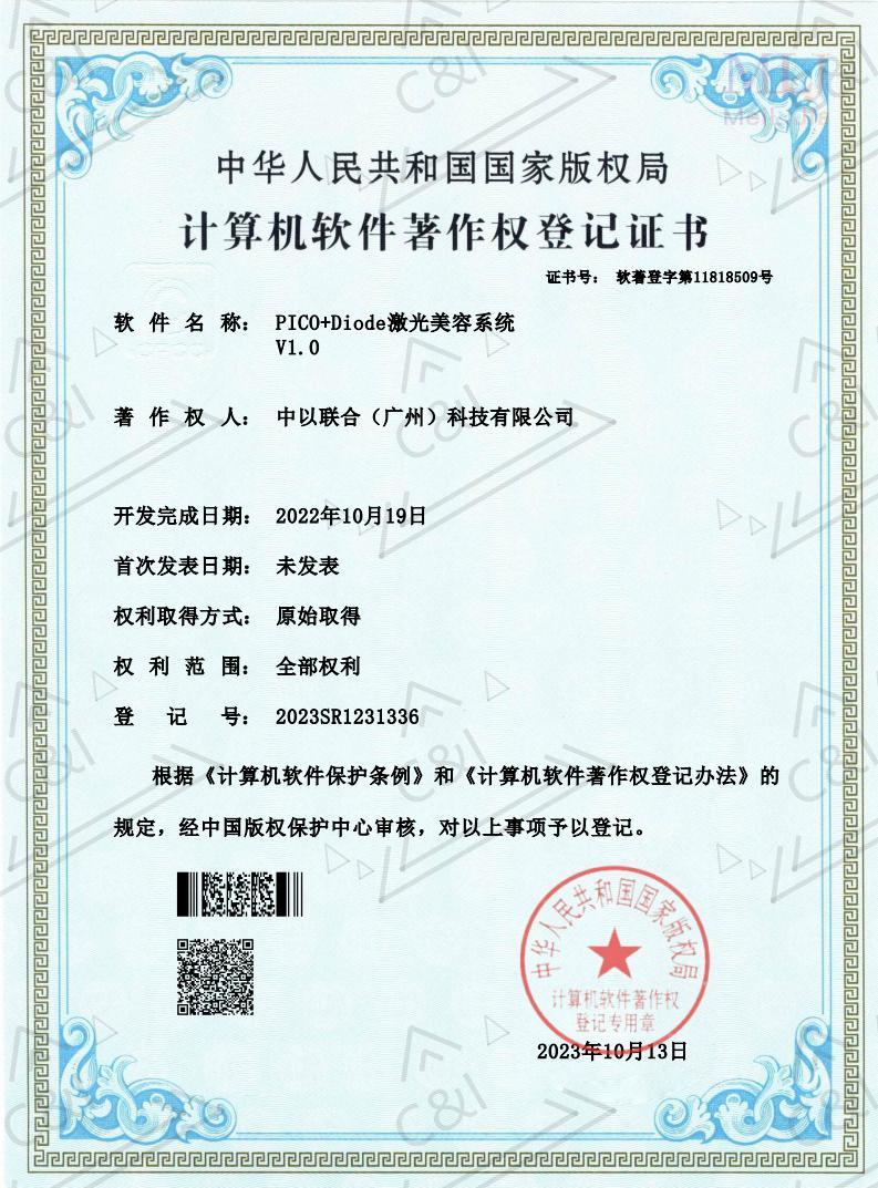 China Israel United (Guangzhou) Technology Co., Ltd. has obtained the software copyright registration certificate for "PICO+Diode Laser Beauty System" issued by the China Copyright Protection Bureau!