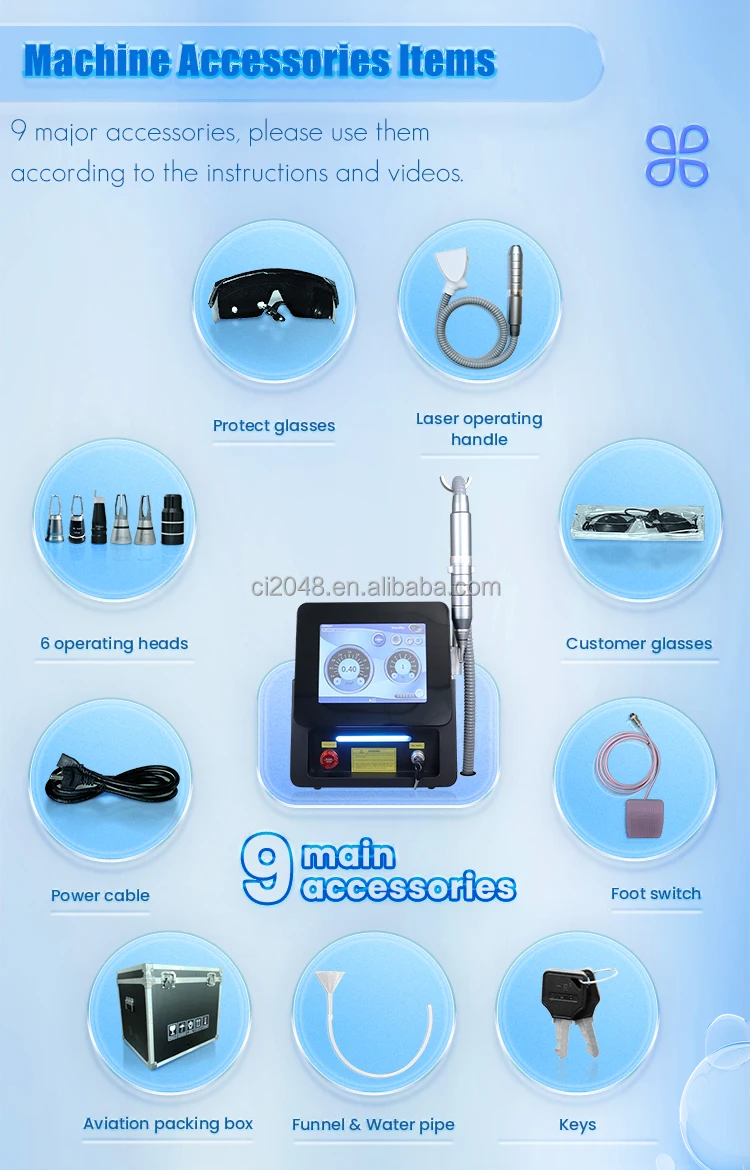 1. Simple operation, you can switch the car through different buttons on the screen. 2. High -power power supply, the machine is powerful. 3. You can adjust the size of the light spots by replacing the head. 4. With a temperature sensor, the cooling system is very good. 5. Metal housing, aviation box packaging, transportation safety. 6. There is an infrared sight, which is more accurate to use 7.narrow pulse width 6ns, lighter pain, comfortabe time. 8.IT Explodes Pigment Instantaneously, Therapeutic Results Occur Instantly