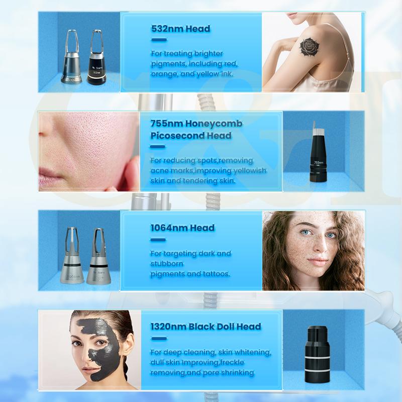 * 1064nm laser head, effectively remove dark tattoos, eyebrow tattoos, lip tattoos, eyeliner, traumatic pigmentation and freckles, etc.(for black, dark blue, gray and dark gray) * 532nm laser head, suitable for red or tan tattoos, eyebrow tattoos, lip liner, and eyeliner. It can effectively dilute red or tan birthmarks and various shallow spots.(for red, orange, yellow, green, blue purple) * 1320nm rejuvenates skin and whitens, shrinks pores * 755nm: used for wrinkles, promoting the regeneration of subcutaneous collagen and skin rejuvenation. Non -scars 1064nm head: (for black, dark blue, gray and dark gray) Non -scars 532nm head: (for red, orange, yellow, green, blue purple)