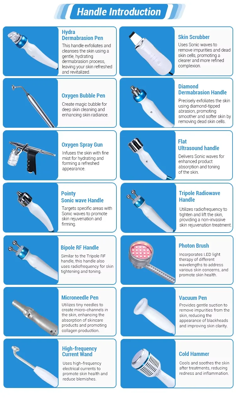 Hydra dermabrasions+diamond micro-dermabrasions+ sound wave+ oxygen spray+ Bio+ Ledings+ Radio wave+ cold hammer+ oxygen
