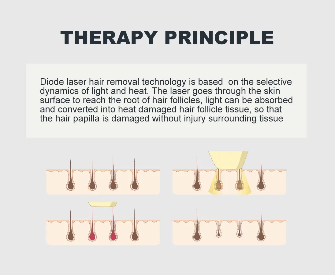 German diode laser hair remove technology is based on the selective kinetics of light and heat. The laser penetrates the skin surface to the root of the hair follicle; directly hits the melanocytes of the hair follicle without damaging the surrounding tissue. The laser can be absorbed by the hair shafts and follicles in the melanin and converted into heat, thereby increasing the temperature of the hair follicles. When the temperature rises enough to irreversibly damage the hair follicle structure, the hair follicle disappears after a period of natural physiological process, thus achieving the purpose of permanent hair removal.