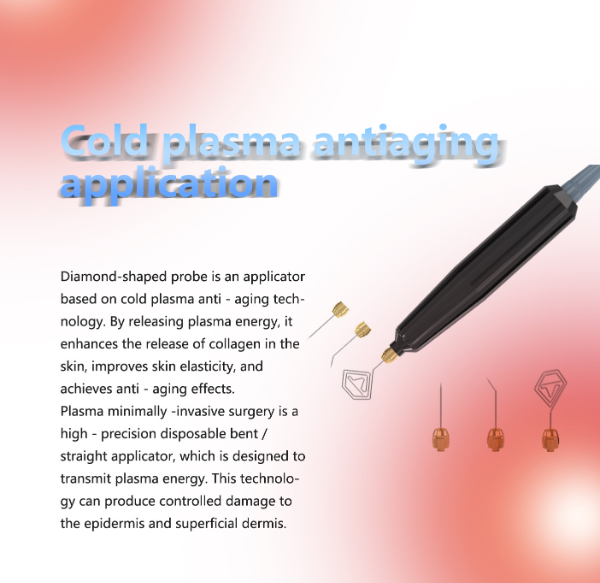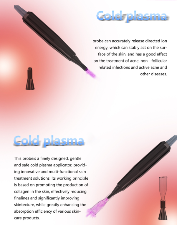 This probe is an application that fuses a fractional needle with cold plasma technology, which scans the skin in a fractional manner during the treatment process, which can target and stimulate the regeneration process of collagen and elastin fibers in the skin. By increasing the content of these key structural proteins in the skin, it effectively reduces the depth of wrinkles, enhances skin firmness, and restores youthful elasticity and radiance.