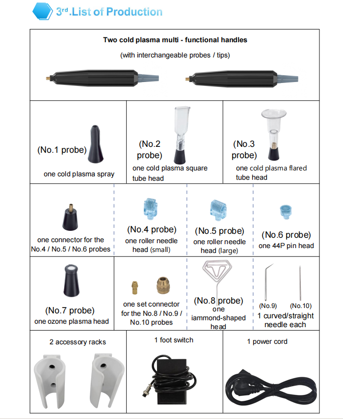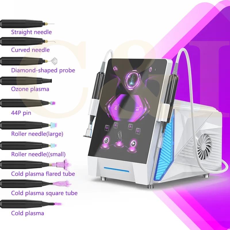 Needle roller - cold plasma scanning needle roller This probe is an applicator that combines a fine needle roller structure with cold plasma technology, in which a column of cold plasma is released into the skin surface in a drip pattern during treatment, thereby optimizing the epidermal cell renewal process and promoting skin micro contraction. This process triggers the contraction and tightening effect of skin cells, resulting in a delicate and smooth skin texture and skin remodeling, which is effective in improving various signs of aging and scarring. • No. 4 probe (small needle roller) - designed for small area treatment, can be precisely applied to the local area. ▪No. 5 probe (needle roller head) - Designed for large areas of skin to cover larger areas of skin.