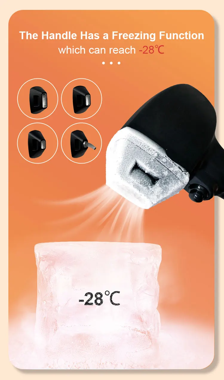 ①-28 ℃ Rapid refrigeration technology, no pain: the unique dynamic cryoprotection system cools the skin epidermis to 5 ℃, which effectively protects the skin from damage, and feels refreshed without burning and tingling;