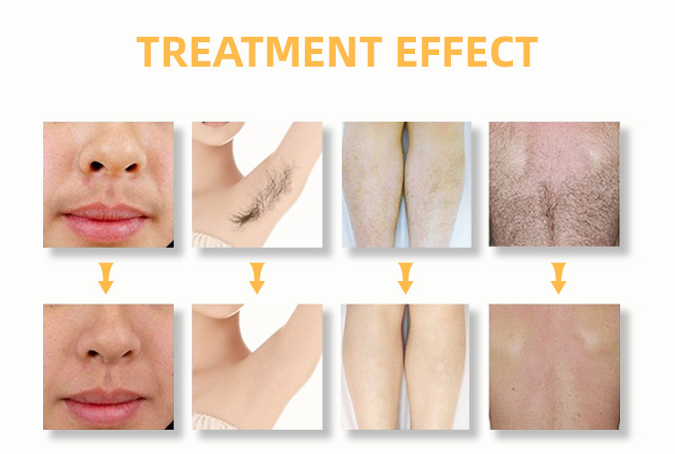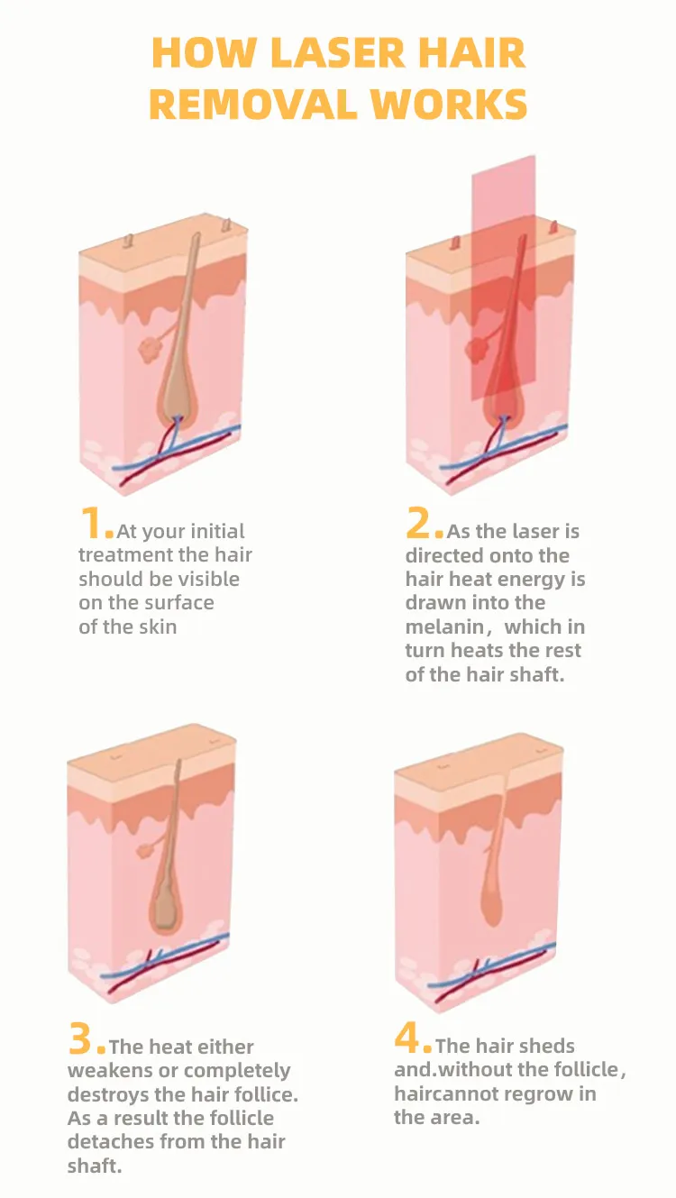 ③Hair removal once and for all: The well-designed laser pulse can directly enter the dermis and be absorbed by the melanin particles in the hair and hair follicles, producing a photothermal effect, completely destroying the hair follicles and hair shafts, and producing permanent hair removal;
