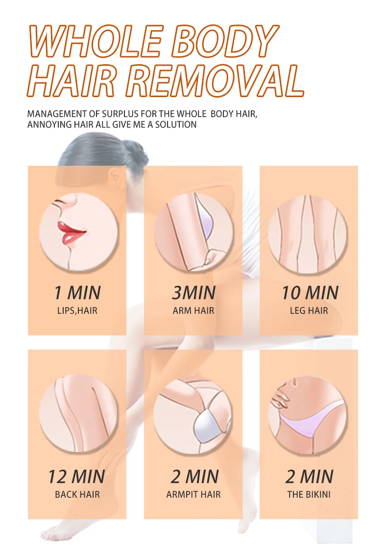 armpit, beard, bikini, chest hair, leg hair, arm hair, hand hair, and the whole body