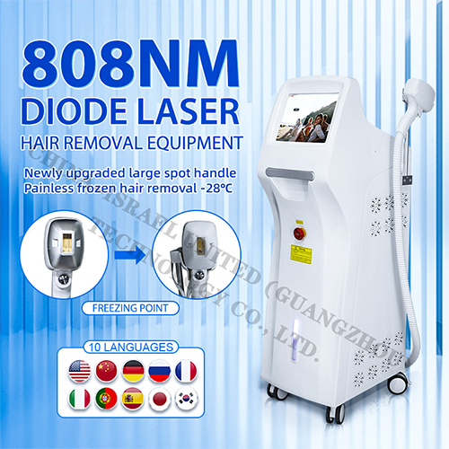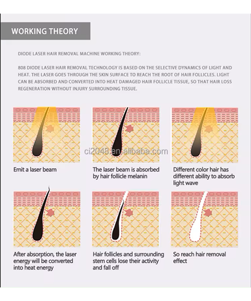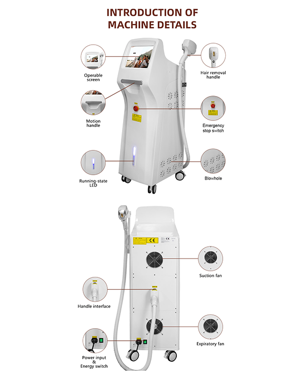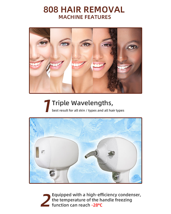 This system uses a special laser with a long pulse width of 808nm that can penetrate hair follicles.Using selective light absorption theory, melanin can preferentially absorb laser light .Then heat the hair shaft and hair follicle to destroy the hair follicle .And the oxygen tissue surrounding the hair follicle. When laser output, the system has special cooling. Technology, cool the skin, protect the skin from damage, and achieve a very safe and comfortable state treatment. At the same time, the machine comes with skin rejuvenation function.