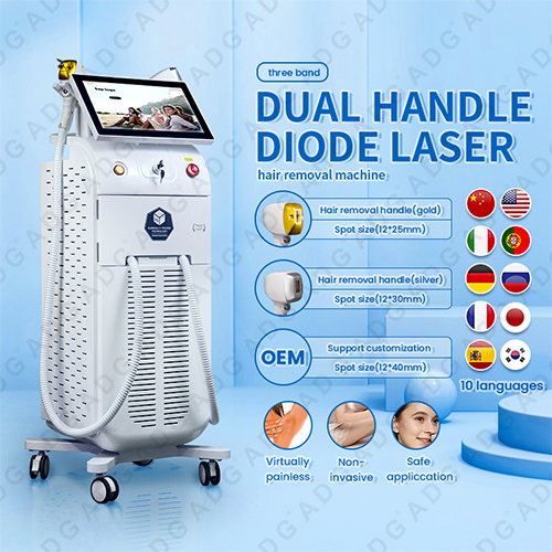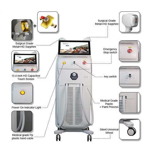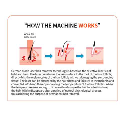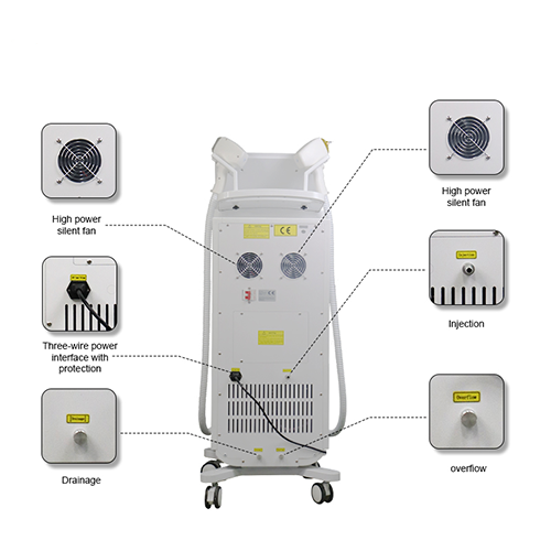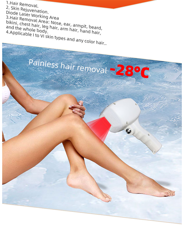 This system uses a special laser with a long pulse width of 808nm that can penetrate hair follicles. Using selective light absorption theory, melanin can preferentially absorb laser light. Then heat the hair shaft and hair follicle to destroy the hair follicle. And the oxygen tissue surrounding the hair follicle. When laser output, the system has special cooling. Technology, cool the skin, protect the skin from damage, and achieve a very safe and comfortable state treatment. At the same time, the machine comes with skin rejuvenation function.