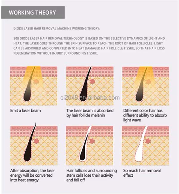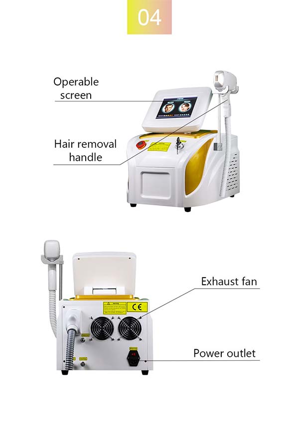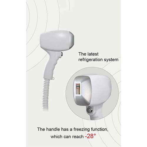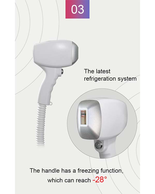 This system uses a special laser with a long pulse width of 808nm that can penetrate hair follicles.Using selective light absorption theory, melanin can preferentially absorb laser light .Then heat the hair shaft and hair follicle to destroy the hair follicle .And the oxygen tissue surrounding the hair follicle. When laser output, the system has special cooling. Technology, cool the skin, protect the skin from damage, and achieve a very safe and comfortable state treatment. At the same time, the machine comes with skin rejuvenation function.