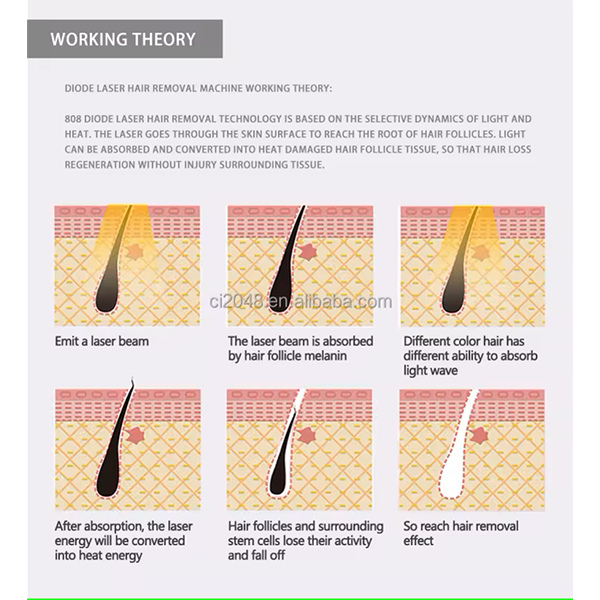 This system uses a special laser with a long pulse width of 808nm that can penetrate hair follicles. Using selective light absorption theory, melanin can preferentially absorb laser light .Then heat the hair shaft and hair follicle to destroy the hair follicle . And the oxygen tissue surrounding the hair follicle.