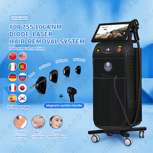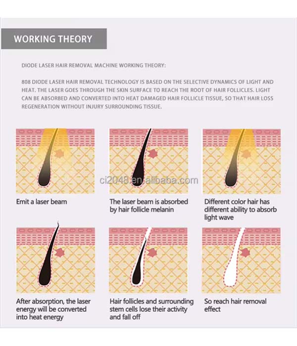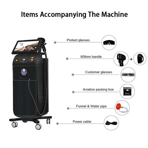 This system uses a special laser with a long pulse width of 808nm that can penetrate hair follicles. Using selective light absorption theory, melanin can preferentially absorb laser light. Then heat the hair shaft and hair follicle to destroy the hair follicle. And the oxygen tissue surrounding the hair follicle. When laser output, the system has special cooling. Technology, cool the skin, protect the skin from damage, and achieve a very safe and comfortable state treatment. At the same time, the machine comes with skin rejuvenation function.