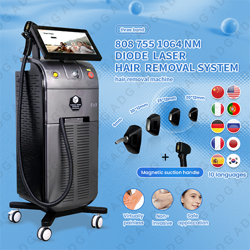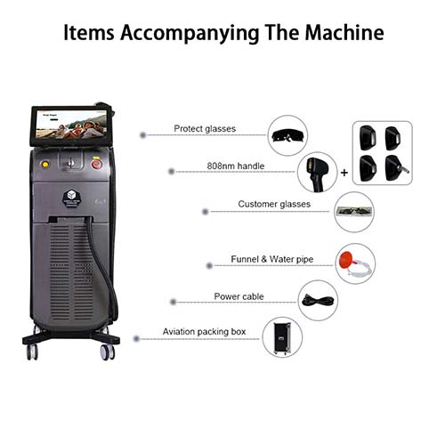 This system uses a special laser with a long pulse width of 808nm that can penetrate hair follicles. Using selective light absorption theory, melanin can preferentially absorb laser light. Then heat the hair shaft and hair follicle to destroy the hair follicle. And the oxygen tissue surrounding the hair follicle. When laser output, the system has special cooling. Technology, cool the skin, protect the skin from damage, and achieve a very safe and comfortable state treatment. At the same time, the machine comes with skin rejuvenation function.