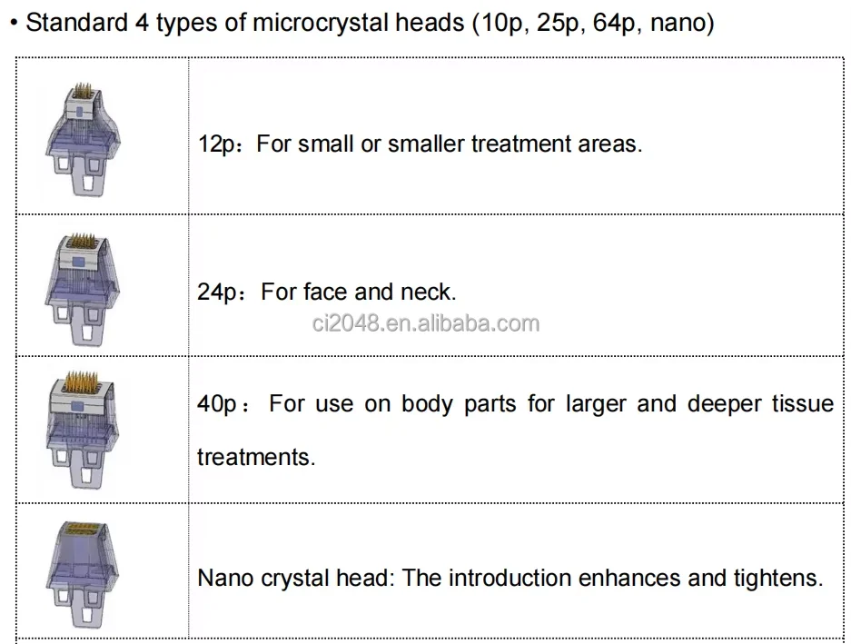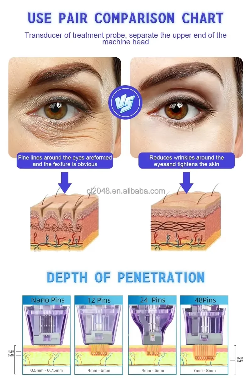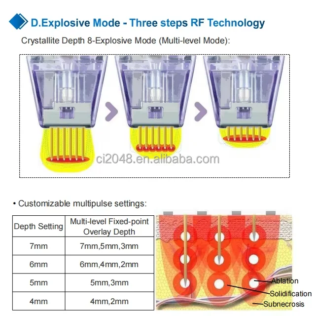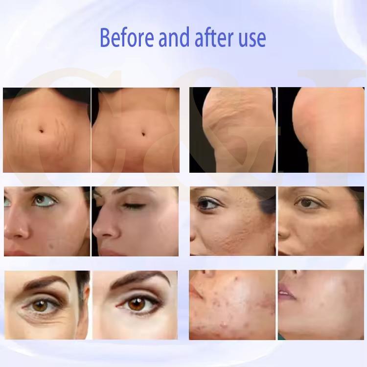 Crystallite Depth 8 is a minimally invasive fractional treatment combining microneedles and RF energy.Under the control of the electronic system, dozens of insulated needles quickly penetrate the epidermis at the same time, emit RF energy from the needle tip, and then quickly exit the skin. RF energy is penetrated deep into the skin through tiny needles, causing tiny damage, penetrating and opening the absorption channel of the skin, so that nutritional products can enter the skin, and trigger the body's natural healing response. At this time, the thermal stimulation generated by RF together stimulates the self-repair mechanism of the skin, while liquefying and destroying fat cells, it shrinks a large area of soft tissue and stimulates the production of skin fibrous tissue and collagen, thereby reducing fat, remodeling and Tighten and lift the skin. In addition, RF can destroy the secretion of sebaceous glands, inhibit inflammation,eliminate acne bacteria, reduce oil secretion, significantly improve large pores, and effectively treat inflammatory acne, etc; for rough and loose skin, fine lines and wrinkles, acne marks, acne pits, and scars ,Stretch marks and other different symptoms for personalized skin care.