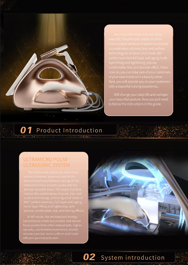 Using MPFU ultra-micro pulse ultrasonic system, horizontal linear acoustic pulse, ring acoustic bidirectional instantaneous energy switching, single machine to achieve point, line, surface combination technology mode to achieve full mode 360° perfect seamless full layer rejuvenation multi-layer lifting tight, accurate and comfortable, fast and durable effect.