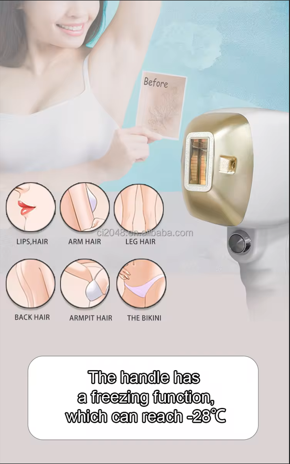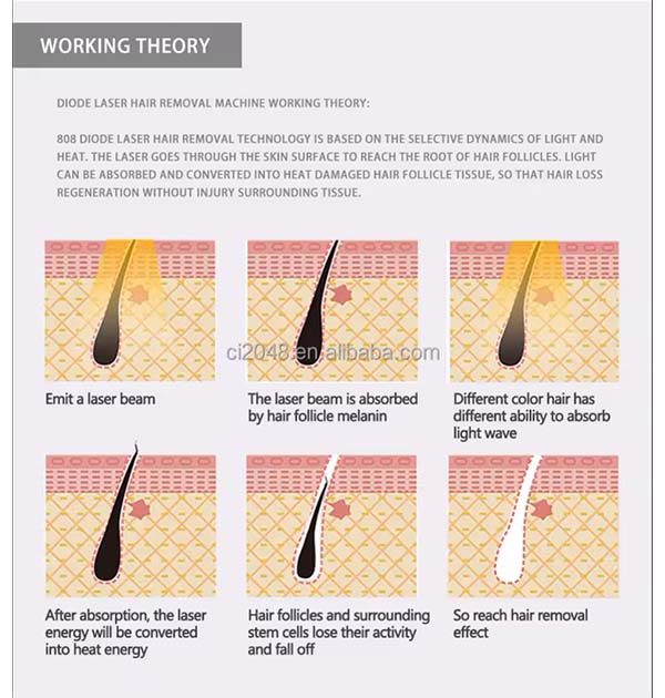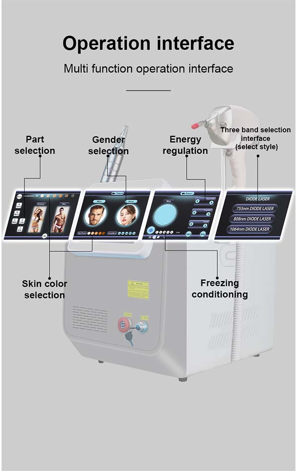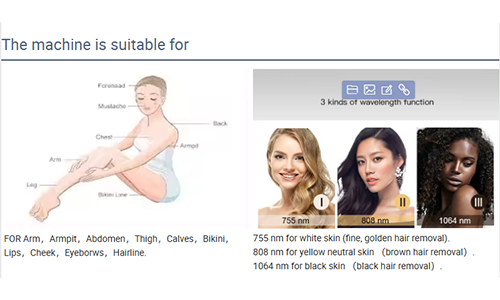 This system uses a special laser with a long pulse width of 808nm that can penetrate hair follicles.Using selective light absorption theory, melanin can preferentially absorb laser light .Then heat the hair shaft and hair follicle to destroy the hair follicle .And the oxygen tissue surrounding the hair follicle. When laser output, the system has special cooling. Technology, cool the skin, protect the skin from damage, and achieve a very safe and comfortable state treatment. At the same time, the machine comes with skin rejuvenation function.