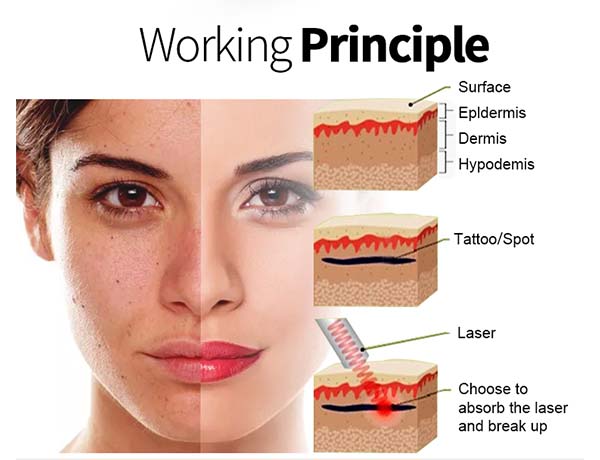 Utilizing the explosive effect of the Pico laser. the laser permeates the epidermis into the dermis and takes effect on pigment mass and is absorbed by pigment. Since the laser pulses is extremely short in nanosecond and comes with super high energy, the pigment mass would swell quickly and break into small pieces, which will be eliminated through metabolism. In this case, the become lighter gradually and finally disappear.