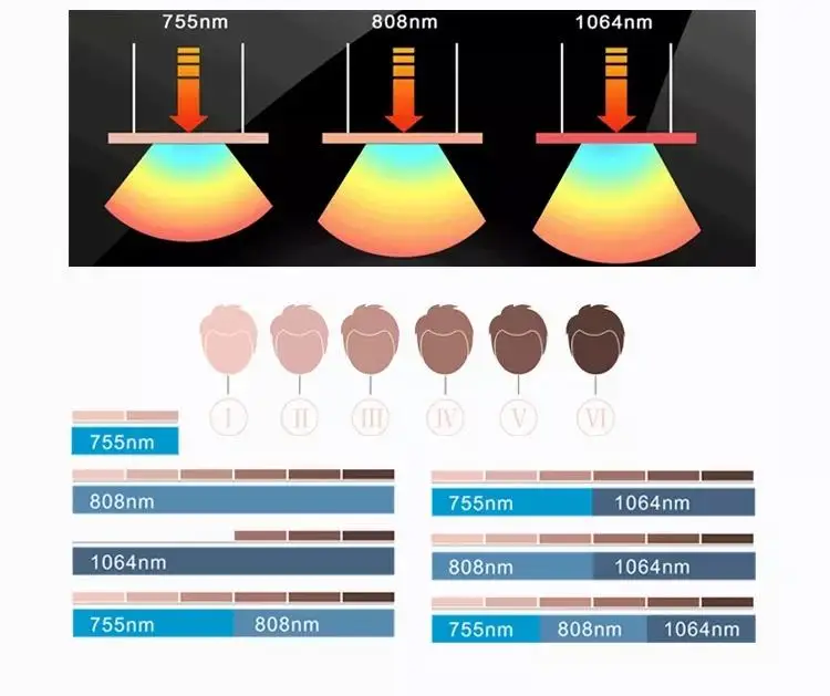 755nm is suitable for fair-skinned people,the 755nm wavelength targets the bulge of the hair follicle and is especially effective for superficially embedded hair.