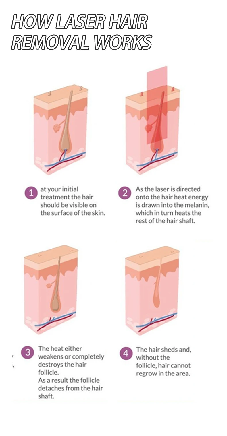 Using selective light absorption theory, melanin can preferentially absorb laser light .Then heat the hair shaft and hair follicle to destroy the hair follicle .And the oxygen tissue surrounding the hair follicle.