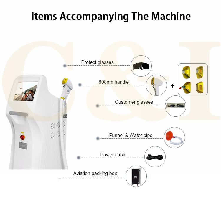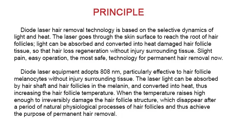 Diode laser equipment adopts 808m,particularly effective to hair follicle melanocytes without injury surrounding tissue. The laser light can be absorbed by hair shaft and hair follicles in the melanin,and converted into heat,thus increasing the hair follicle temperature.When the temperature raises high enough to irreversibly damage the hair follicle structure which disappear after a period of natural physiological processes of hair follicles and thus achieve the purpose of permanent hair removal.