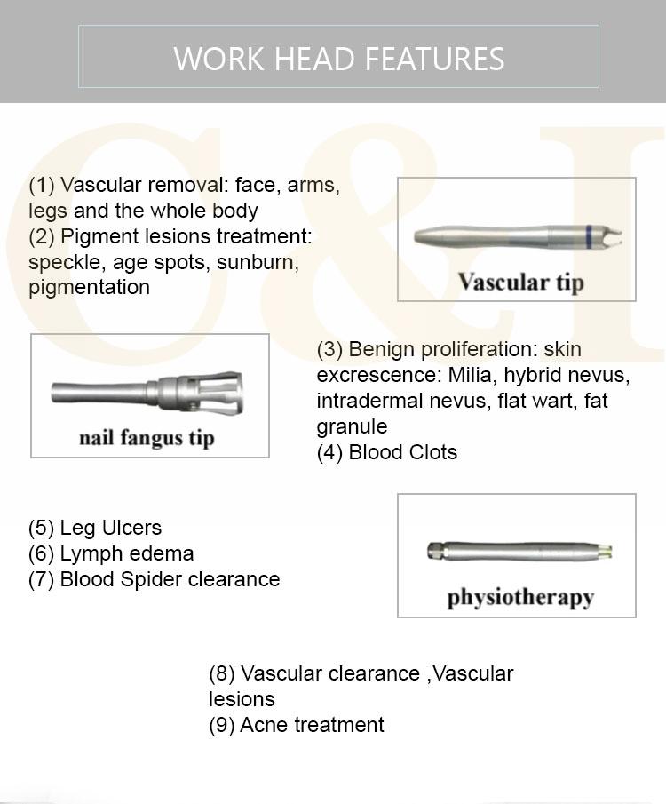 2) To overcome the traditional laser treatment redness large area of burning the skin, professional design hand-piece, enabling the 980nm laser beam is focused onto a 0.2-0.5mm diameter range, in order to enable more focused energy to reach the target tissue, while avoiding burn the surrounding skin tissue.
