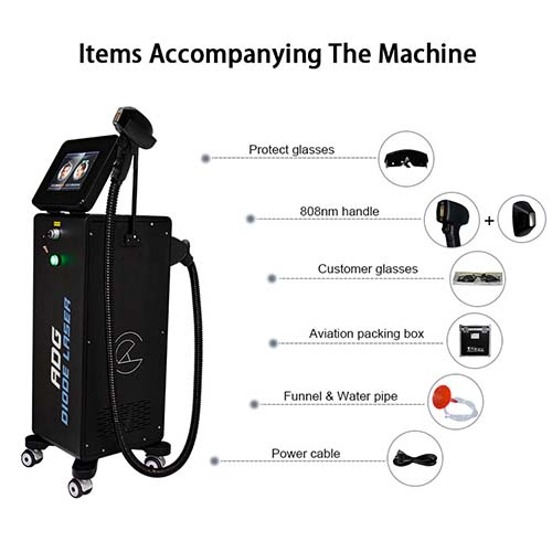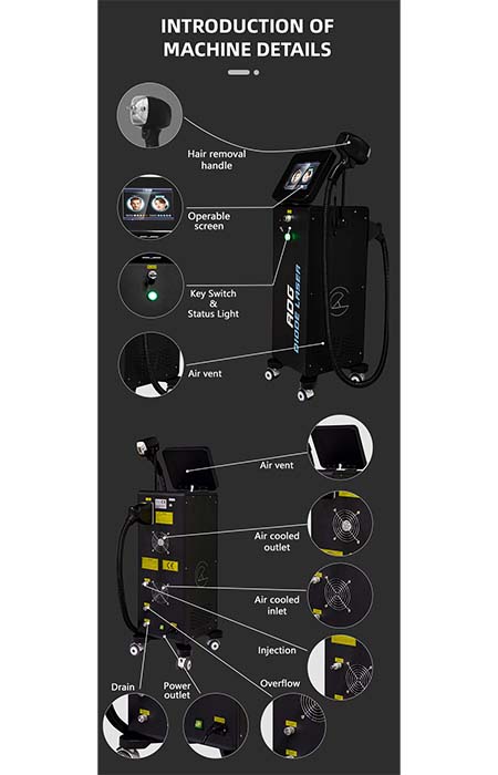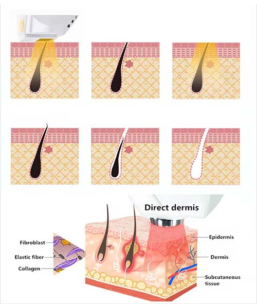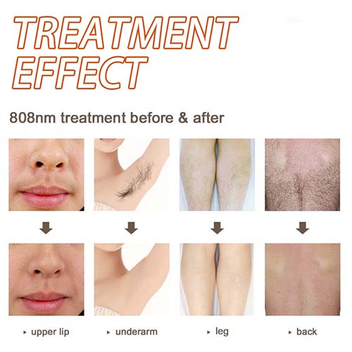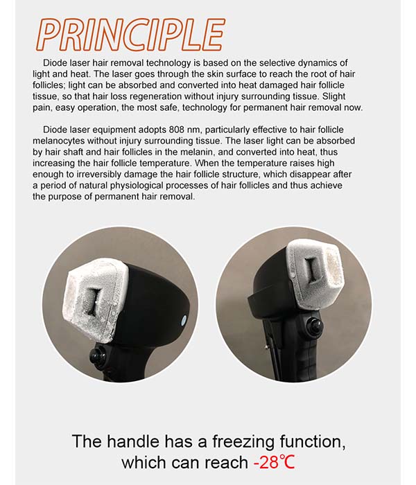 This system uses a special laser with a long pulse width of 808nm that can penetrate hair follicles.Using selective light absorption theory, melanin can preferentially absorb laser light .Then heat the hair shaft and hair follicle to destroy the hair follicle .And the oxygen tissue surrounding the hair follicle. When laser output, the system has special cooling. Technology, cool the skin, protect the skin from damage, and achieve a very safe and comfortable state treatment. At the same time, the machine comes with skin rejuvenation function.