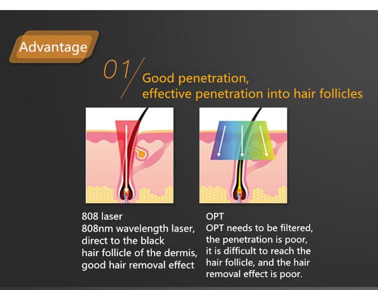 As an integrated solution, our machine combines the benefits of wavelengths 808nminto one handle,wavelengths have different laser characteristics. Targeting different tissue depths as well as structures within the hair follicle. Thus to the greatest extent to ensure the effective treatment and Virtually painless, achieves the safest and most comprehensive hair removal treatment available today. Really reach: painless, fast, effective and suitable for all kinds of skin type easily .