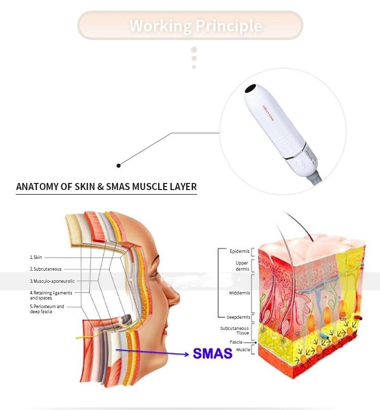 Using mechanical radar wave good tissue penetration, accurately transfer 65-72 degrees of thermal energy to each layer of skin, 1.5 epidermis, 3.0 dermis, 4.5 fascia, 4.5 collagen layer (another ), 13 fat layer, 8.0 shape, a variety of treatment heads effectively stimulate fibroblasts to split new cells at 40 times per second, dissolve facial fat cells, tighten skin contours, repair damaged fiber woven, stimulate collagen cell regeneration, fast Achieve the effect of thin face and tight Q bomb. At the same time, the precise positioning of the radar wave can actively identify the fat cells, and the effect of the bomb can reach the depth of the target through the unique probe friction treatment/therapy side, so that the patient does not feel pain.