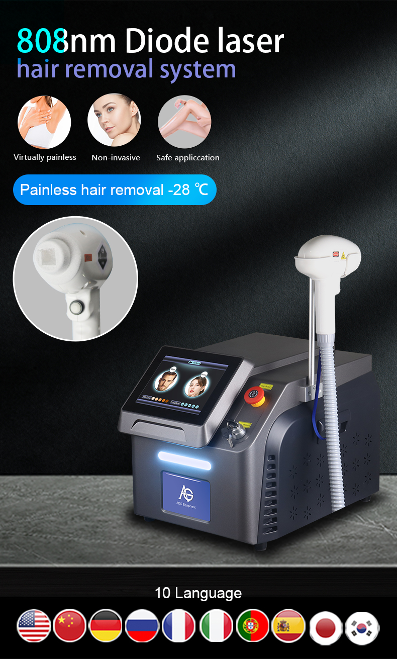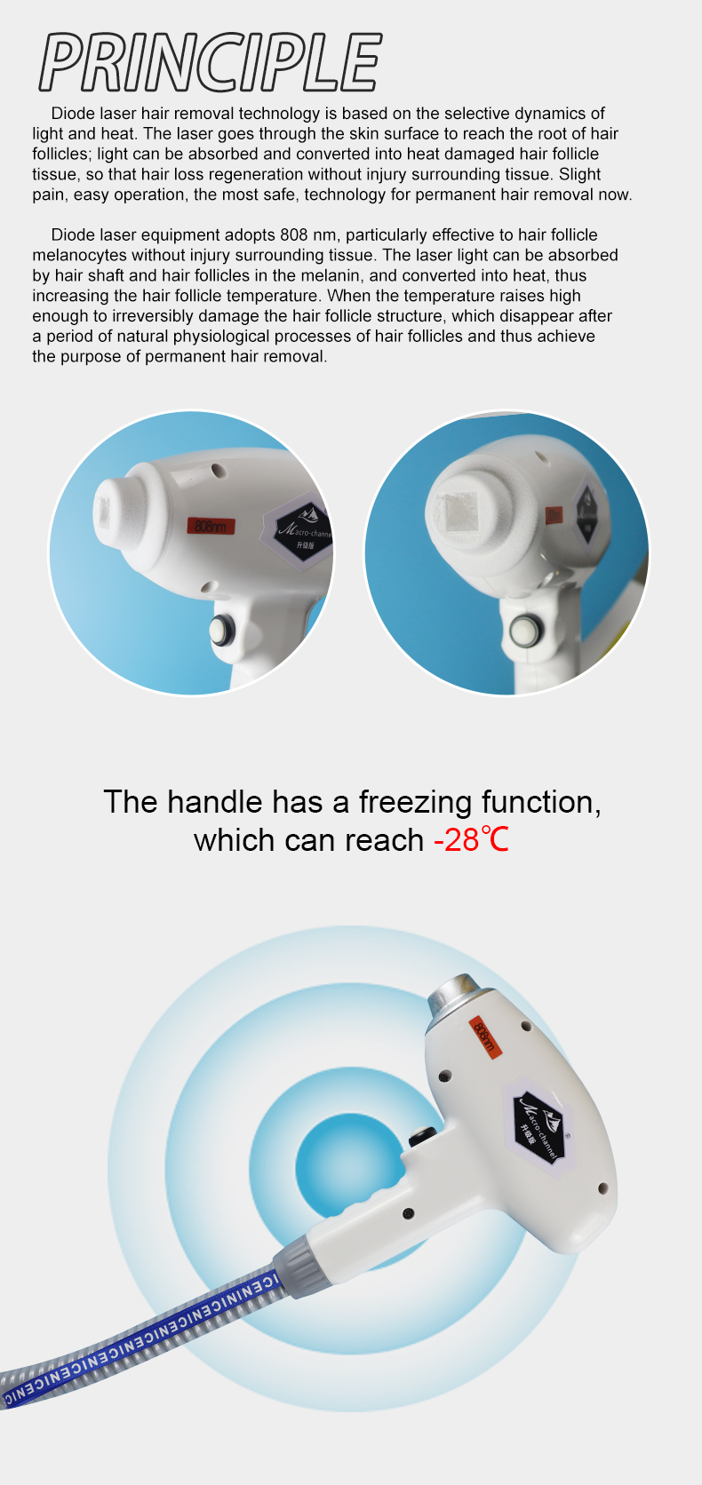 808nm freezing point hair removal is the most advanced permanent laser hair removal method. Based on the principle of selective photothermal action and freezing point semiconductor laser hair removal equipment, the laser penetrates the skin surface to keep the hair follicles at a certain temperature and gently inactivate the hair follicles and surrounding stem cells. To achieve the purpose of permanent hair removal.