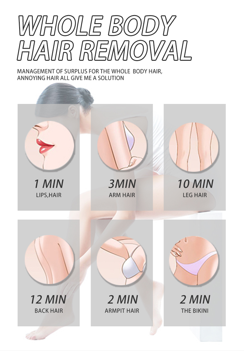 1. Permanent hair removal in different areas: Lip hair,beard, chest hair, armpit hair, back hair,arm hair, leg hair and