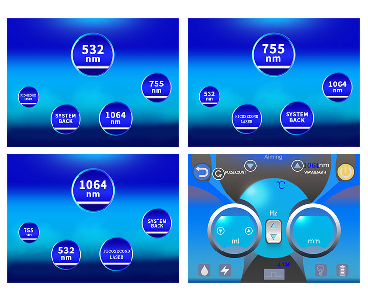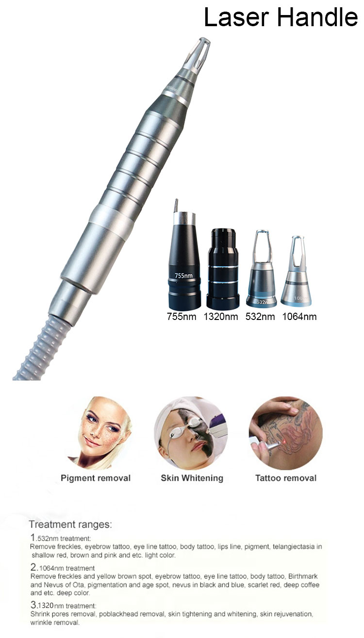 5. 1320nm is a toner black face doll, used for facial whitening .The 1064nm and 532nm treatment heads are used to remove tattoos and freckle.The 755 tip is for skin rejuvenation